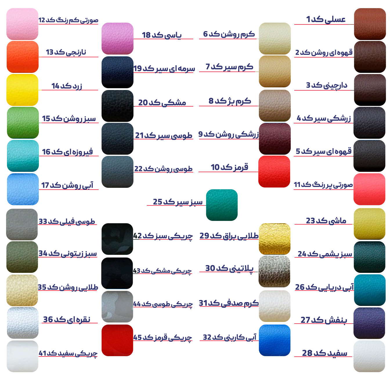 آبی درباری کد 26 ,آبی روشن کد 17 ,آبی کاربنی کد 32 ,بنفش کد 27 ,پلاتینی کد 30 ,چریکی سبز کد 42 ,چریکی سفید کد 41 ,چریکی طوسی کد 44 ,چریکی قرمز کد 45 ,چریکی مشکی کد 43 ,دارچینی کد 3 ,زرد کد 14 ,زرشکی روشن کد 9 ,زرشکی سیر کد 4 ,سبز روشن کد 15 ,سبز زیتونی کد 34 ,سبز سیر کد 25 ,سبز یشمی کد 24 ,سرمه ای سیر کد 19 ,سفید کد 28 ,صورتی پررنگ کد 11 ,صورتی کم رنگ کد 12 ,طلایی براق کد 29 ,طلایی روشن کد 35 ,طوسی روشن کد 22 ,طوسی سیر کد 21 ,طوسی فیلی کد 33 ,عسلی کد 1 ,فیروزه ای کد 16 ,قرمز کد 10 ,قهوه ای روشن کد 2 ,قهوه ای سیر کد 5 ,کرم بژ کد 8 ,کرم روشن کد 6 ,کرم سیر کد 7 ,کرم صدفی کد 31 ,ماشی کد 23 ,مشکی کد 20 ,نارنجی کد 13 ,نقره ای کد 36 ,یاسی کد 18 |